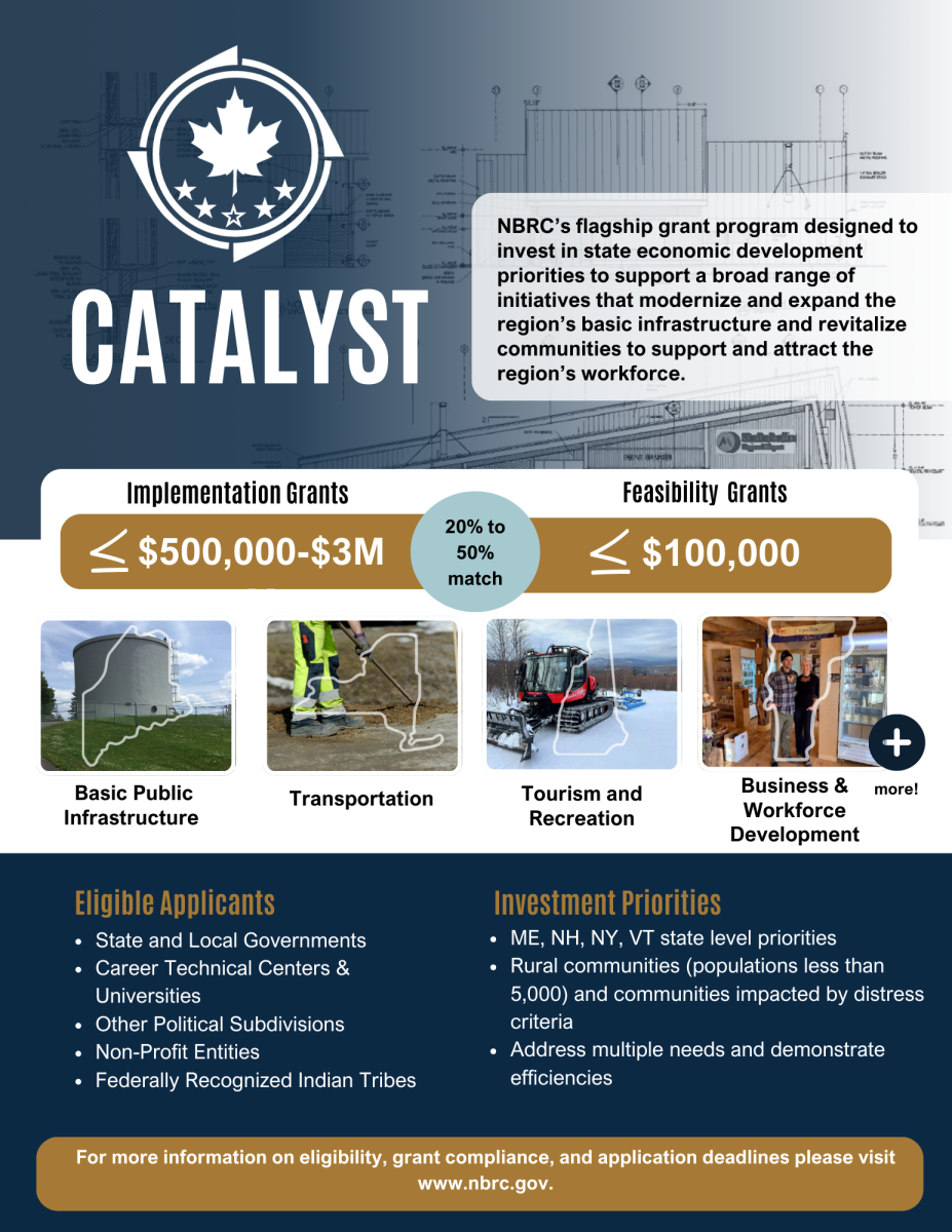 The Catalyst Program is NBRC’s flagship competitive grant program, formerly known as the State Economic & Infrastructure Development (SEID) program. Through Catalyst, NBRC invests in state economic development priorities to support a broad range of initiatives that modernize and expand the Northern Border region’s basic infrastructure and revitalizes communities to support and attract the region’s workforce.
